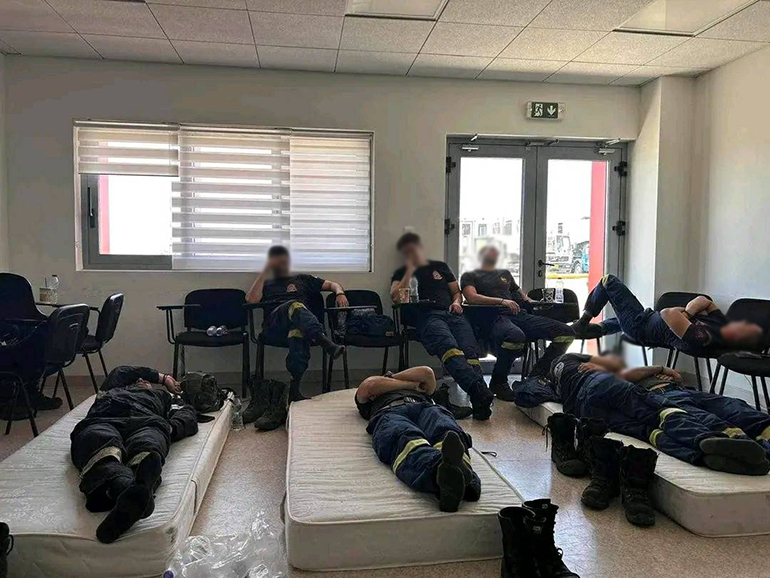 Ωστόσο, αυτό το περιστατικό, όπως όλα δείχνουν, δεν ήταν μεμονωμένο. Νέα καταγγελία είδε το φως της δημοσιότητας τις τελευταίες ώρες που συνοδεύεται με φωτογραφικό υλικό και δείχνει πυροσβέστες που επιχειρούσαν στο μέτωπο της Ρόδου να κοιμούνται σε αυτοσχέδια στρώματα, στις καρέκλες και στα τραπέζια.