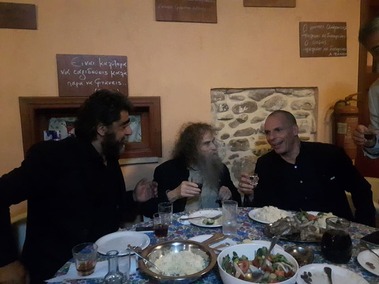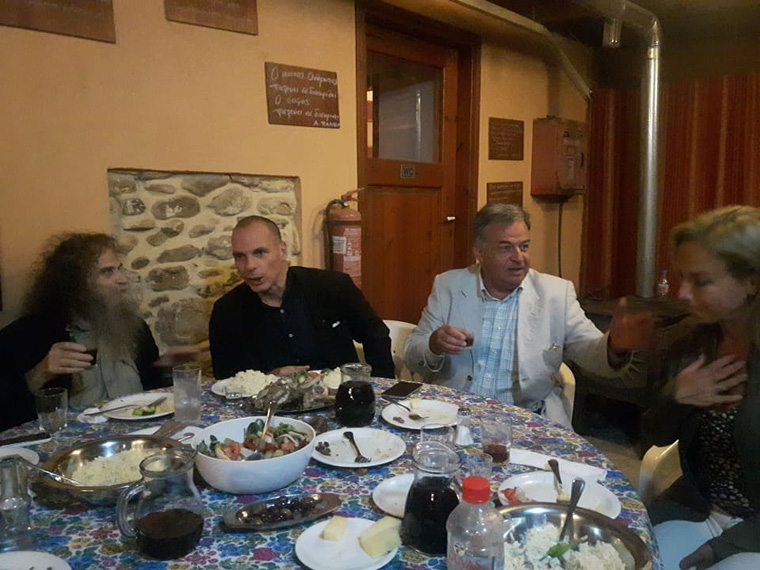 Ο κ. Βαρουφάκης είχε την ευκαιρία να απολαύσει σε ταβέρνα του Γαζίου κρητικούς μεζέδες, ρακή, καθώς και τις κοντυλιές του Ψαραντώνη.