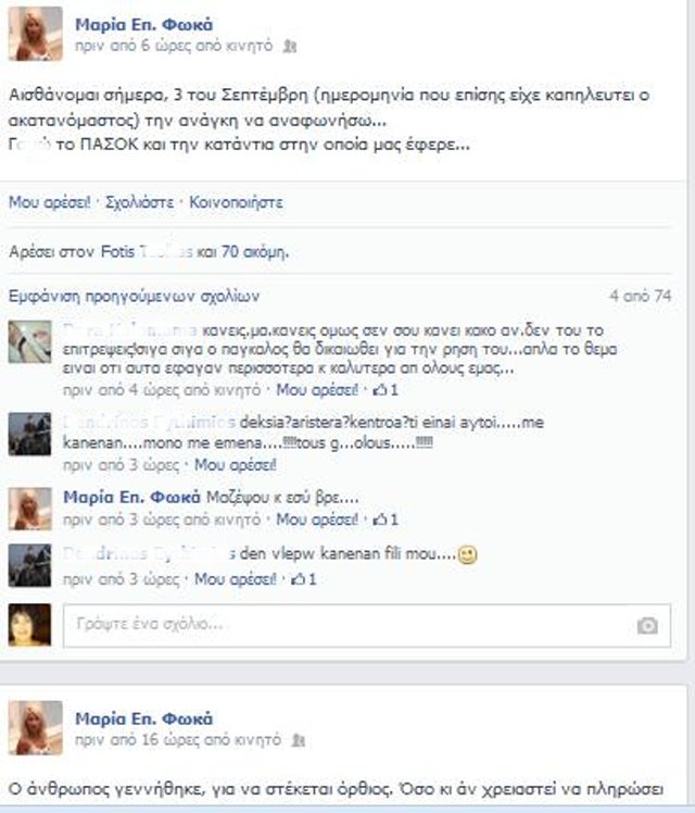 «Φωτιές» άναψε χθες στο Διαδίκτυο η πολιτεύτρια της ΝΔ από το Μεσολόγγι Μαρία Φωκά, η οποία με αφορμή τα 39α γενέθλια του ΠΑΣΟΚ έγραψε στο facebook: «Αισθάνομαι, σήμερα 3 του Σεπτέμβρη, την ανάγκη να αναφωνήσω: “Γ..ω το ΠΑΣΟΚ και την κατάντια στην οποία μας έφερε…”».
