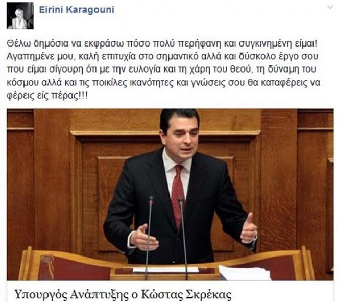 Αναφέρει χαρακτηριστικά η Ειρήνη Καραγκούνη, για τον κ. Σκρέκα: «Θέλω δημόσια να εκφράσω πόσο πολύ περήφανη και συγκινημένη είμαι! Αγαπημένε μου, καλή επιτυχία στο σημαντικό αλλά και δύσκολο έργο σου που είμαι σίγουρη ότι με την ευλογία και τη χάρη του Θεού, τη δύναμη του κόσμου αλλά και τις ποικίλες ικανότητες και γνώσεις σου θα καταφέρεις να φέρεις εις πέρας…!!!».