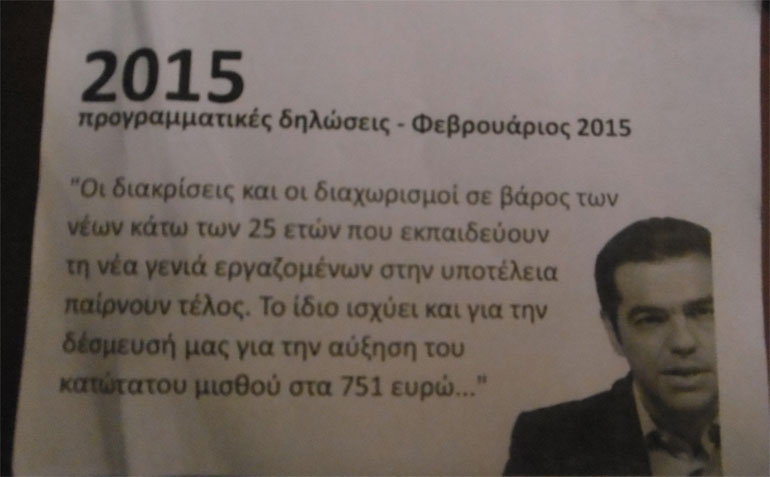 Στα φέιγ βολάν που πέταξαν περίπου 20 άτομα αναγράφονταν οι προγραμματικές δηλώσεις Τσίπρα τον Φεβρουάριο του 2015, στις οποίες υποσχόταν αύξηση του κατώτατου μισθού στα 751 ευρώ, ώστε να πάρουν τέλος «οι διακρίσεις και οι διαχωρισμοί των νέων κάτω των 25 ετών».