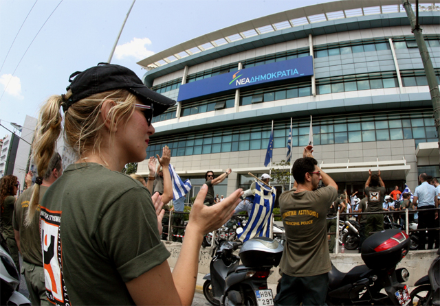 Άστραψαν τα φλας των φωτογράφων κατά τη διάρκεια της συγκέντρωσης διαμαρτυρίας των δημοτικών αστυνομικών έξω από τα γραφεία της Νέας Δημοκρατίας στη Συγγρού.