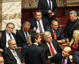 Με ένα λεπτό διαφορά, κάθισαν στα έδρανά τους ο πρόεδρος του ΠΑΣΟΚ Ευάγγελος Βενιζέλος και ο πρόεδρος των ΑΝΕΛ Πάνος Καμμένος, ο πρώτος στις 12:01 και ο δεύτερος στις 12:02.
