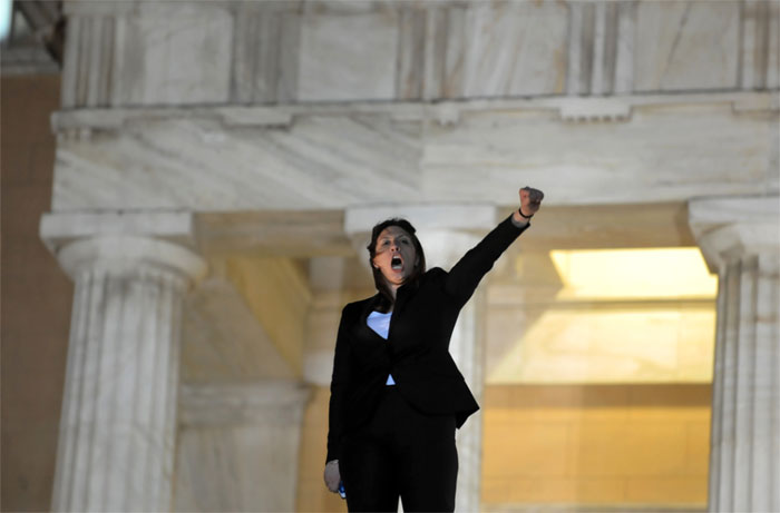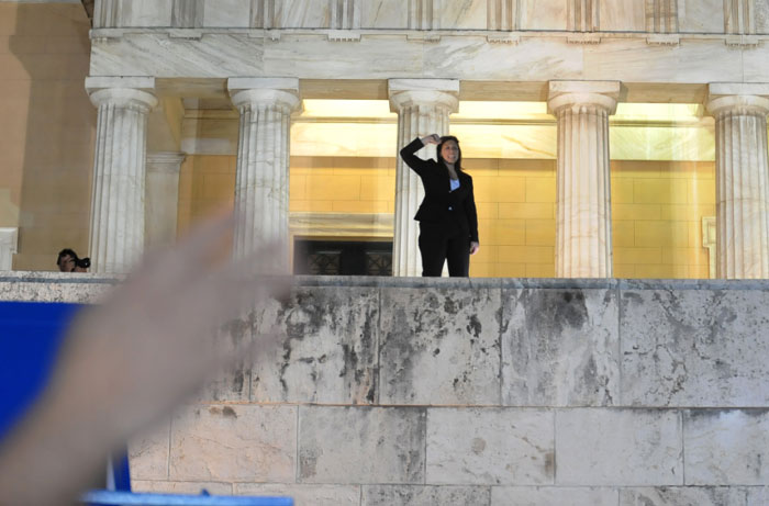 Η κα. Κωνσταντοπούλου, έχοντας το κινητό ανά χείρας -για παν ενδεχόμενο- προέταξε το αριστερό της χέρι και… φρόνημα προς τους διαδηλωτές καλώντας τους να ψηφίσουν υπέρ του «όχι».