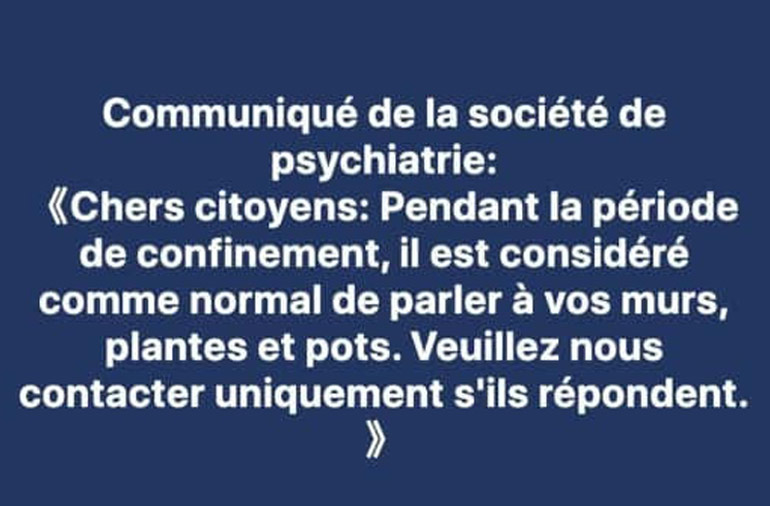 Η γαλλική εταιρεία ψυχιατρικής απευθυνόμενη στους Γάλλους πολίτες που βρίσκονται σε καθεστώς εγκλεισμού, προσπαθεί να σαρκάσει με λεπτό χιούμορ και καλή διάθεση την κατάσταση που επικρατεί και να διασκεδάσει τις φοβίες των ανθρώπων.