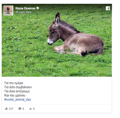 Με τη φωτογραφία ενός γαϊδουριού επέλεξε να γιορτάσει την Παγκόσμια Ημέρα Ζώων η περιφερειάρχης Αττικής Ρένα Δούρου.