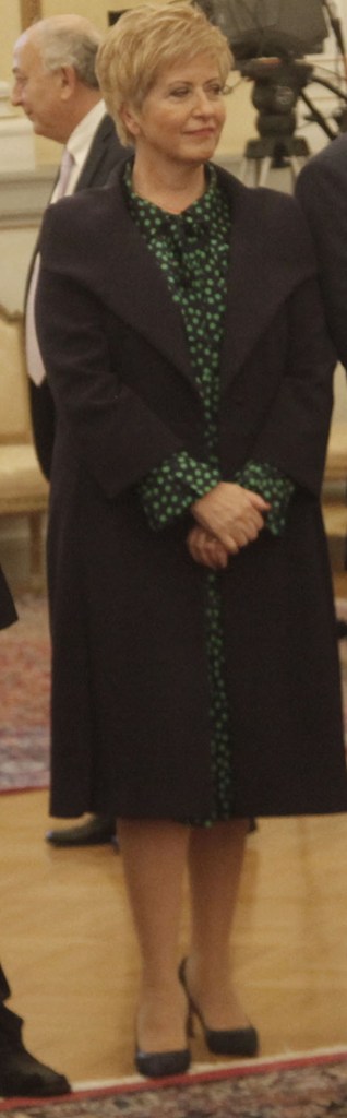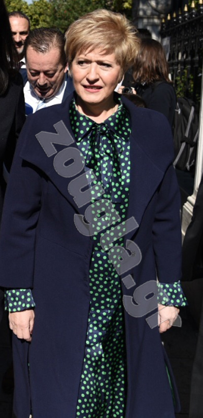 Εντυπωσιακή ήταν τέλος η εμφάνιση της κας. Κόλλιας-Τσαρουχά, η οποία κινήθηκε σε λίγο πιο έντονα χρώματα, φορώντας μπλε παλτό και πουά πράσινο-μπλε φόρεμα.