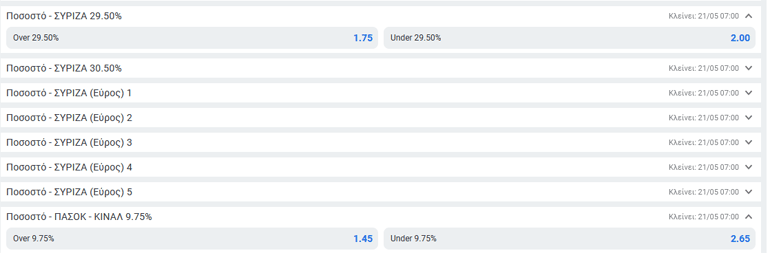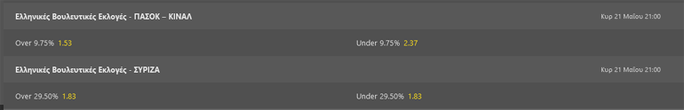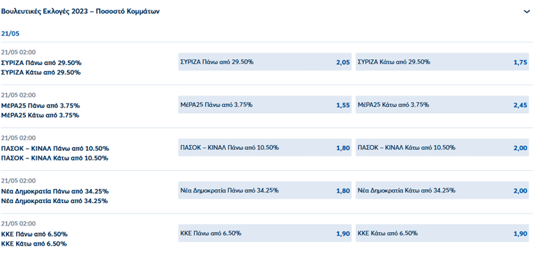 Σε ότι αφορά το ΠΑΣΟΚ – Κίνημα Αλλαγή του Νίκου Ανδρουλάκη οι τιμές των ποσοστών παίζουν από το Over 9.5% έως 10.5%, ενώ για το ΣΥΡΙΖΑ υπάρχει μία… καθολική συμφωνία στο Over 29.5%.
