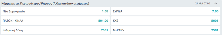 Από εκεί και πέρα ακολουθεί ο ΣΥΡΙΖΑ σε τιμές από 6.50 έως, 7.50, ενώ το ΠΑΣΟΚ παίζει σε αποδόσεις 300 έως 501!