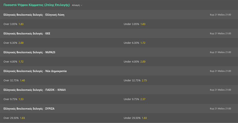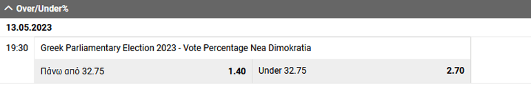 Στα ειδικά στοιχήματα η Νέα Δημοκρατία έχει τιμές φαβορί για να συγκεντρώσει πάνω από 32% έως και πάνω από 40%.