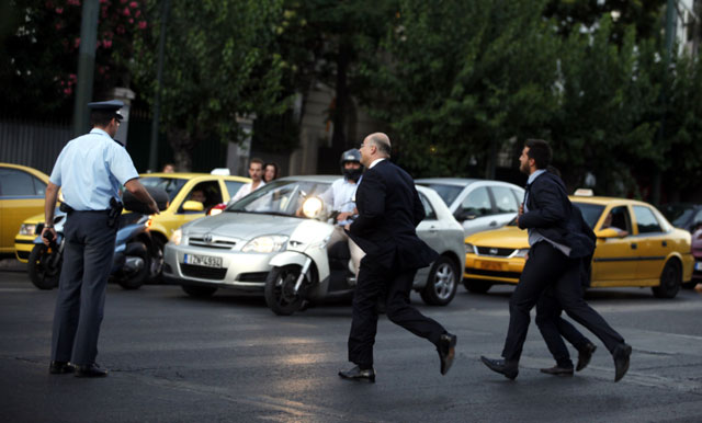 Λίγο πριν την τελετή ο φωτογραφικός φακός «συνέλαβε» τον κ. Δένδια να τρέχει, προκειμένου να περάσει στο απέναντι πεζοδρόμιο, φυσικά με την συνδρομή αστυνομικού και της όμορφης τροχονόμου…