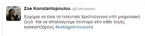 Την ευχή «να είναι τα τελευταία Χριστούγεννα υπό μνημονιακό ζυγό» έστειλε με ανάρτησή της στο Twitter η τέως πρόεδρος της Βουλής Ζωή Κωνσταντοπούλου, την ημέρα των Χριστουγέννων,...