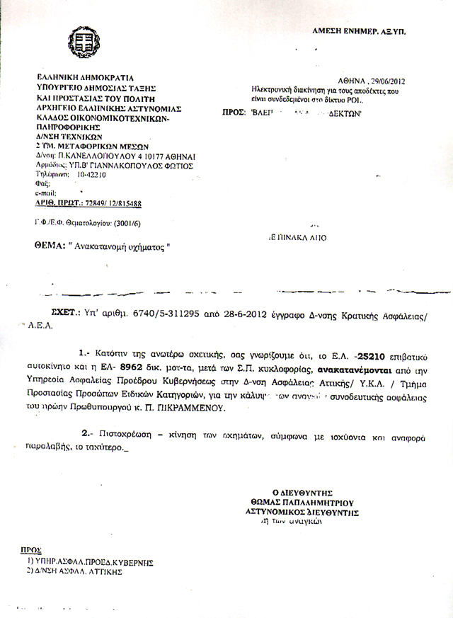 Μία αίτηση στα γραφεία της Γενικής Αστυνομικής Διεύθυνσης Αττικής τράβηξε σαν μαγνήτης τα μάτια των αστυνομικών, προκαλώντας τους πολλά ερωτήματα. Τη στιγμή μάλιστα που οι υπερασπιστές της έννομης τάξης βλέπουν τους μισθούς τους να ψαλιδίζονται κάθε μέρα με μειώσεις που αγγίζουν το 20%, τέτοιες επιθυμίες σαν και αυτές που αναγράφονται στην αίτηση και που αφορούν στον πρώην υπηρεσιακό Πρωθυπουργό Παναγιώτη Πικραμμένο, βοήθησαν ώστε να ανέβει σε κάποιους το αίμα στο κεφάλι.