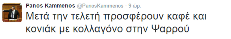 «Μετά την τελετή προσφέρουν καφέ και κονιάκ με κολλαγόνο στην Ψαρρού», σχολίασε στο Twitter ο υπουργός Άμυνας και πρόεδρος των Ανεξαρτήτων Ελλήνων Πάνος Καμμένος.