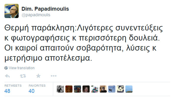 «Θερμή παράκληση: Λιγότερες συνεντεύξεις και φωτογραφίσεις και περισσότερη δουλειά. Οι καιροί απαιτούν σοβαρότητα, λύσεις και μετρήσιμο αποτέλεσμα», είναι η σχετική του ανάρτηση στο twitter.