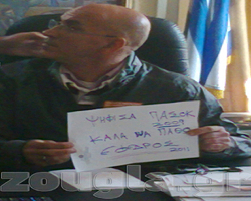 Ο Πάρις Κουκουλόπουλος, εκ Κοζάνης, έμπειρος στα της Τοπικής Αυτοδιοίκησης παρακολουθεί χαμογελαστός τον συνδικαλιστή να δείχνει στον φακό ένα λευκό χαρτί με το σύνθημα « Καλά να πάθω που ψήφισα ΠΑΣΟΚ» και υπογραφή «Ένας έφεδρος».