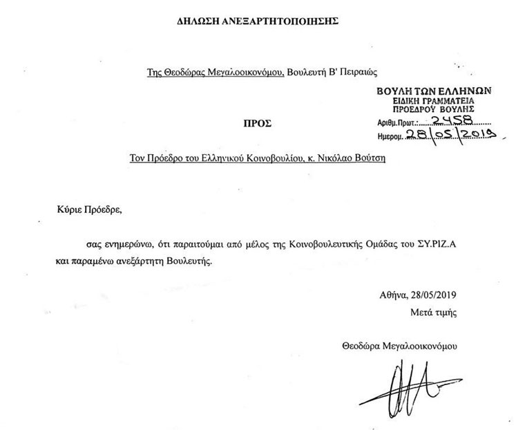 Με επιστολή της ανακοίνωσε ότι αποχωρεί από την Κοινοβουλευτική Ομάδα του ΣΥΡΙΖΑ η Θεοδώρα Μεγαλοοικονόμου. Παραμένει για λίγες μέρες ανεξάρτητη, ενώ φέρεται να φεύγει απογοητευμένη από την ΚΟ.
