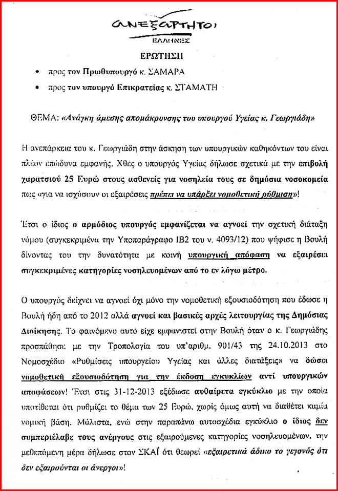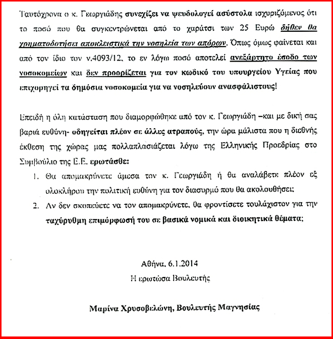 «…Έτσι ο ίδιος ο αρμόδιος Υπουργός εμφανίζεται να αγνοεί στη σχετική διάταξη νόμου (συγκεκριμένα την Υποπαράγραφο ΙΒ2 του ν.4093/12) που ψήφισε η Βουλή δίνοντάς του τη δυνατότητα με κοινή υπουργική απόφαση να εξαιρέσει συγκεκριμένες κατηγορίες νοσηλευομένων από το εν λόγω μέτρο. Ο Υπουργός δείχνει να αγνοεί όχι μόνο την νομοθετική εξουσιοδότηση που έδωσε η Βουλή ήδη από το 2012 αλλά αγνοεί και βασικές αρχές λειτουργίας της Δημόσιας Διοίκησης…» αναφέρει στην ερώτησή της προς τον Πρωθυπουργό και τον Υπουργό Επικρατείας η Μαρίνα Χρυσοβελώνη.
