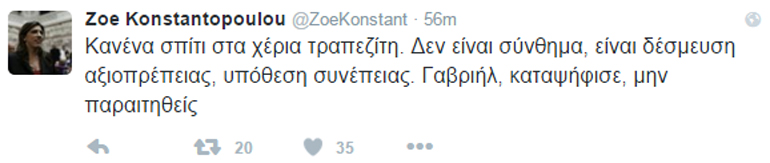 Μήνυμα προς τον Γαβριήλ Σακελλαρίδη έστειλε το πρωί της Πέμπτης η πρώην πρόεδρος της Βουλής, Ζωή Κωνσταντοπούλου, μέσω του λογαριασμού της στο twitter.