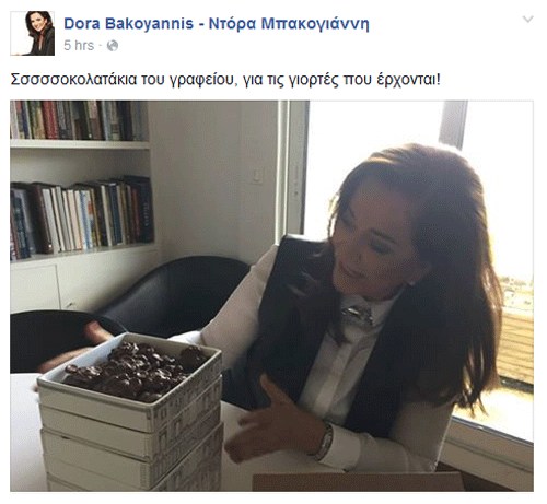 Και ποιος δεν θυμάται τη θρυλική ατάκα της Ντόρας Μπακογιάννη «παιδιά ένα σοκολατάκι, κάτι…», που έχει γίνει viral εδώ και αρκετά χρόνια. Η ίδια η πολιτικός τρόλαρε σήμερα τον εαυτό της χρησιμοποιώντας μια φωτογραφία και μια χιουμοριστική λεζάντα μέσα από τον προσωπικό της λογαριασμό στο facebook.