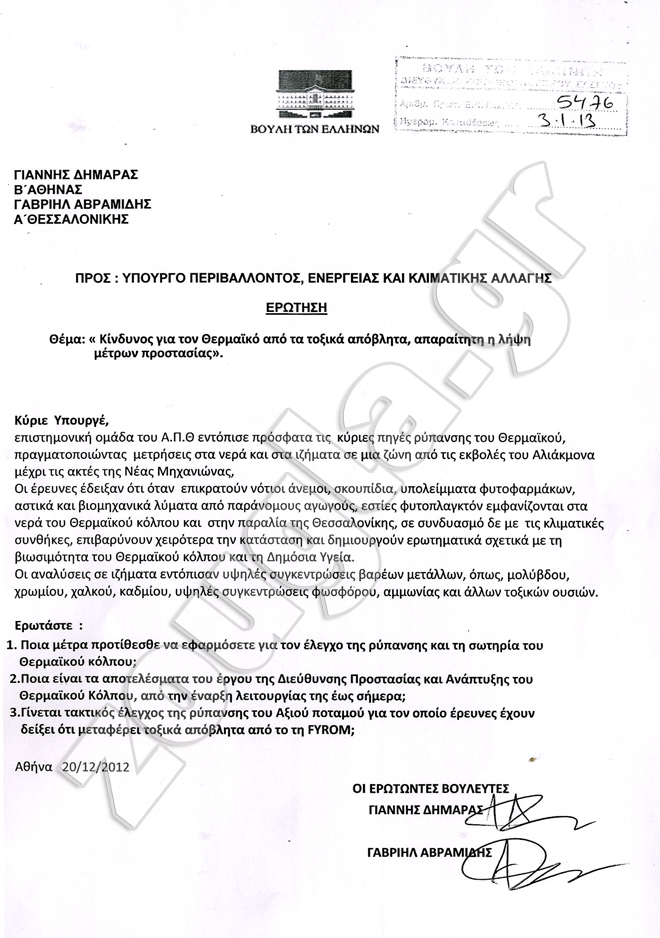 Οι δύο βουλευτές ζητούν να μάθουν ποια μέτρα προτίθεται να πάρει το υπουργείο Περιβάλλοντος για τον έλεγχο της ρύπανσης και τη σωτηρία του Θερμαϊκού κόλπου.