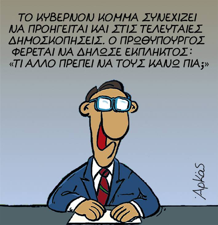 Με το μοναδικό σκωπτικό του ύφος σχολιάζει για μία ακόμη φορά τις τρέχουσες πολιτικές εξελίξεις και τα ευρήματα των δημοσκοπήσεων ο γνωστός σκιτσογράφος Αρκάς.