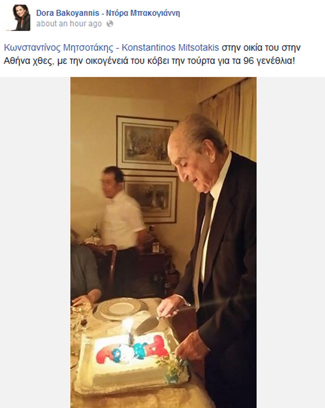 Τα 96 του χρόνια έκλεισε χθες ο επίτιμος πρόεδρος της ΝΔ Κωνσταντίνος Μητσοτάκης. Οι οικείοι του, μεταξύ άλλων και η Ντόρα Μπακογιάννη, βρέθηκαν στο σπίτι του στην Αθήνα, όπου ο Κωνσταντίνος Μητσοτάκης έσβησε τα κεράκια της γενέθλιας τούρτας του.