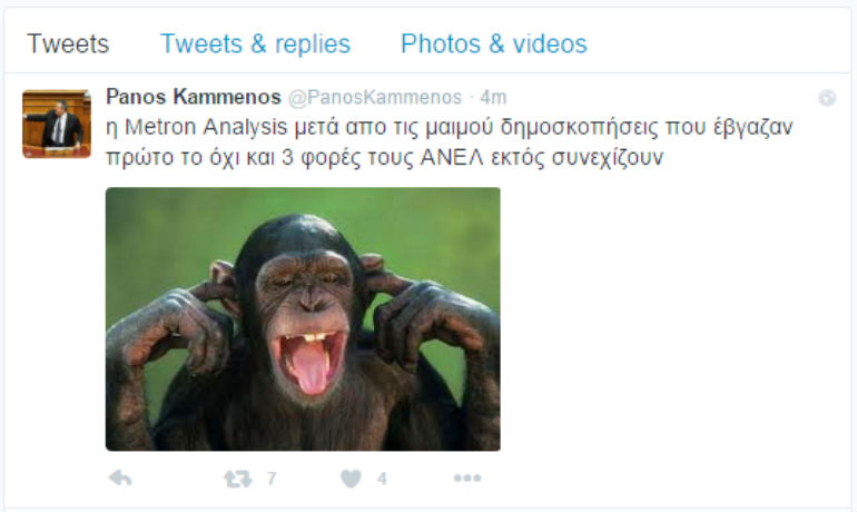 Μέσω σχολίου του στο Twitter, o επικεφαλής των ΑΝΕΛ, σημείωσε: «η Metron Analysis μετά από τις μαϊμού δημοσκοπήσεις που έβγαζαν πρώτο το όχι και 3 φορές τους ΑΝΕΛ εκτός συνεχίζουν», ενώ το… τιτίβισμα συνοδευόταν από μία… χαρακτηριστική φωτογραφία.