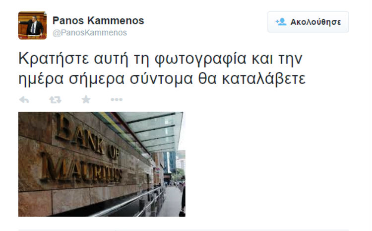Ο επικεφαλής των Ανεξαρτήτων Ελλήνων, ανήρτησε στον προσωπικό του λογαριασμό μια φωτογραφία της Τράπεζας του Μαυρίκιου, σχολιάζοντας ότι σύντομα οι ακόλουθοί του στον ιστότοπο κοινωνικής δικτύωσης θα καταλάβουν το νόημά του tweet.