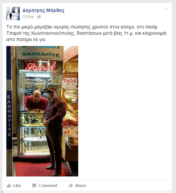«Το πιο μικρό μαγαζάκι αγοράς-πώλησης χρυσού στον κόσμο, στο Μισίρ Τσαρσί της Κωνσταντινούπολης, διαστάσεων μετά βίας 1τ.μ. και κληρονομιά από πατέρα σε γιο», έγραψε στον προσωπικό του λογαριασμό στο facebook.
