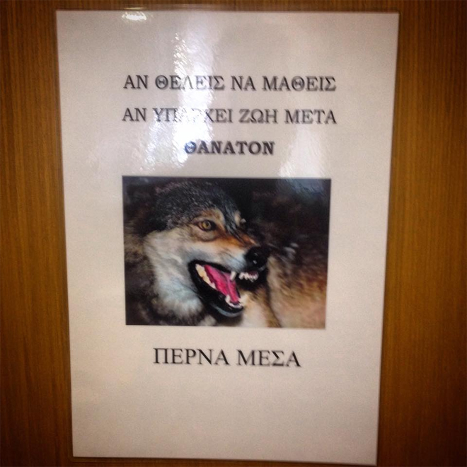 Σε μια από τις πόρτες τοποθετήθηκε φωτογραφία μ’ έναν λύκο και από κάτω το μήνυμα: «Αν θες να μάθεις αν υπάρχει ζωή μετά θάνατον, πέρνα μέσα».