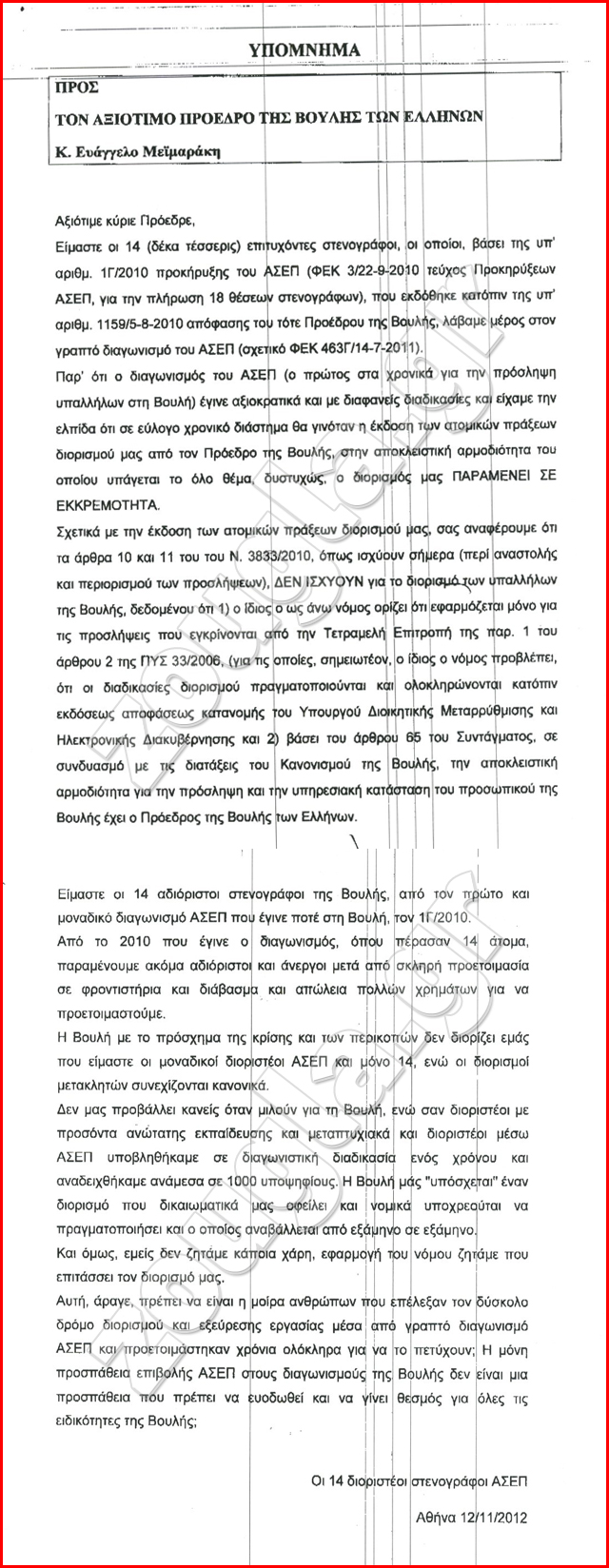 Είναι οι δεκατέσσερις επιτυχόντες στενογράφοι, οι μόνοι που δικαιούνται αξιοκρατικά στασίδι στον «ναό της Δημοκρατίας», αφού είναι οι πρώτοι που πέρασαν με ΑΣΕΠ, αλλά ο Θεός της πολιτικής αγκαλιάζει αυτούς που εκείνος θέλει.