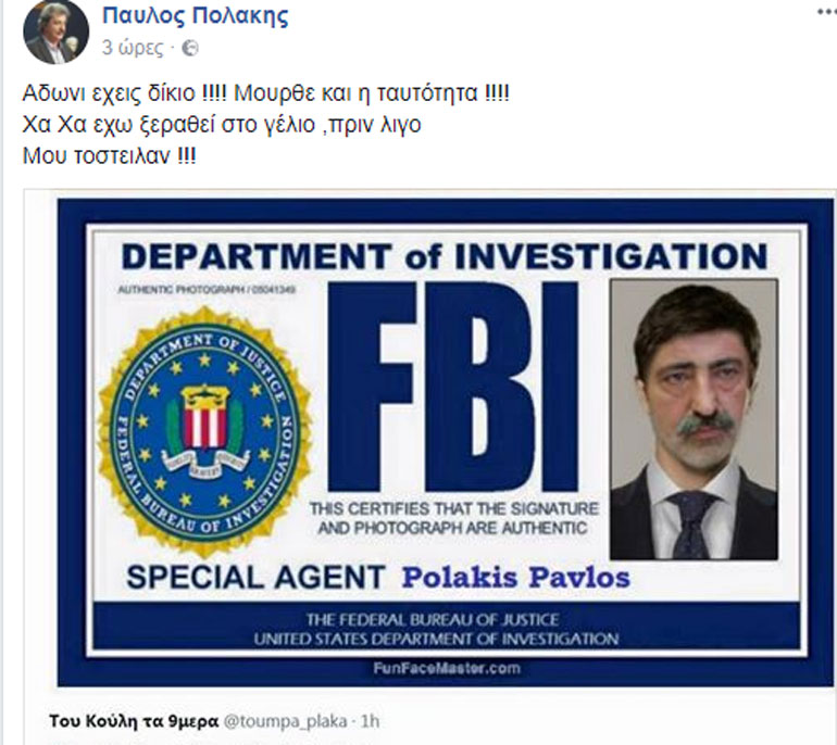 Ως «πράκτορα του FBI» παρουσιάζει τον εαυτό του σε ανάρτησή του στον προσωπικό του λογαριασμό στο Facebook ο Παύλος Πολάκης και προκαλεί τον Ανδρέα Λοβέρδο, τον Άδωνι Γεωργιάδη και τον Ευάγγελο Βενιζέλο.