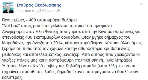 «Πέντε μέρες – 400 εκατομμύρια δολάρια “Not bad” όπως μου είπε γελώντας το πρωί στο τηλέφωνο». Το παραπάνω σχόλιο ανήκει στον επικεφαλής του «Ποταμιού» Σταύρο Θεοδωράκη ο οποίος στην προσωπική του σελίδα στο Facebook, αποκάλυψε με θαυμασμό, μια αλήθεια για τον Δήμαρχο Μαραθώνα Ηλία Ψινάκη που λίγοι ξέρουν.