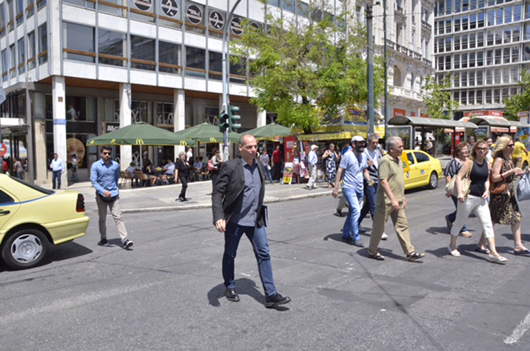 Με χαλαρή διάθεση εμφανίστηκε σήμερα το πρωί να βγαίνει από το υπουργείο Οικονομικών με κατεύθυνση τη βουλή, ο Γιάνης Βαρουφάκης, πλαισιωμένος από συνεργάτη του.