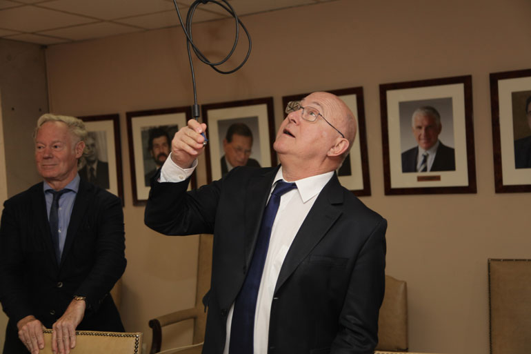 Tον γύρο του διαδικτύου κάνουν φωτογραφίες στις οποίες φαίνεται ο Μισέλ Σαπέν να προσπαθεί να μαζέψει… τα καλώδια του προτζέκτορα που κρέμονταν από το ταβάνι, ακριβώς πάνω από το σημείο όπου θα καθόταν.