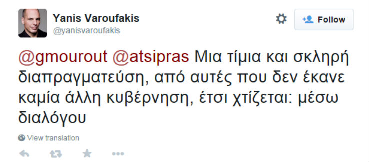 Όποιος στοιχημάτιζε ότι ο Γιάνης Βαρουφάκης δεν θα σηκώσει το γάντι, έχασε τα λεφτά του, με τον υπουργό να διατηρεί το πάντοτε ατάραχο ύφος του και να απαντά ότι οι σκληρές διαπραγματεύσεις χτίζονται μέσω διαλόγου.