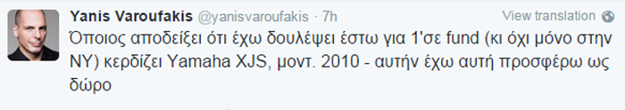 «Όποιος αποδείξει ότι έχω δουλέψει έστω για 1′ σε fund (κι όχι μόνο στην NY) κερδίζει Yamaha XJS, μοντ. 2010 – αυτήν έχω αυτή προσφέρω ως δώρo».