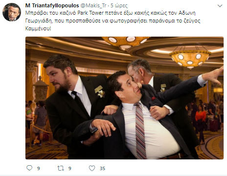 Κάτι τέτοιο συνέβη και σήμερα στο twitter, όταν ο Μάκης Τριανταφυλλόπουλος δημοσίευσε «φωτογραφία – ντοκουμέντο» στην οποία φαίνονται οι μπράβοι σε καζίνο να διώχνουν κακήν κακώς τoν Άδωνι Γεωργιάδη ο οποίος- σύμφωνα με την υπόθεση – προσπαθούσε να φωτογραφίσει το ζεύγος Καμμένου…