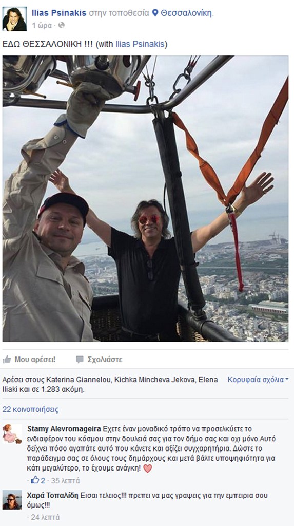 Στον ουρανό της Θεσσαλονίκης πετά αυτήν την ώρα το αερόστατο στο οποίο επιβαίνει ο δήμαρχος Μαραθώνα Ηλίας Ψινάκης. Στις 11.00 αναμένεται να προσγειωθεί στην περιοχή του Λευκού Πύργου.