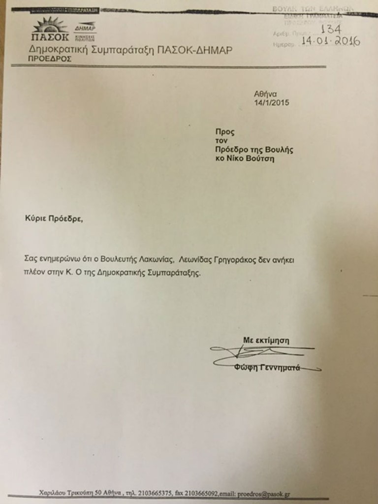 Κάπως έτσι, η κα Γεννηματά υπέπεσε σε ένα μικρό σφάλμα, με αποτέλεσμα να διαγράψει τον Λεωνίδα Γρηγοράκο με έγγραφο το οποίο έφερε την ημερομηνία 14 Ιανουαρίου 2015…