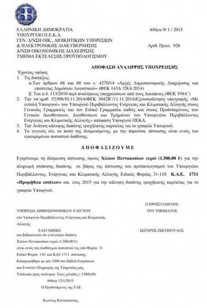 Πλήθος επικριτικών σχολίων έχει προκαλέσει η δημοσιοποίηση της απόφασης με ημερομηνία 9/1/2015 για προμήθεια καρέκλας αξίας 1.500 ευρώ, η οποία προορίζεται για το γραφείο του υπουργού Περιβάλλοντος και Κλιματικής Αλλαγής, Γιάννη Μανιάτη.