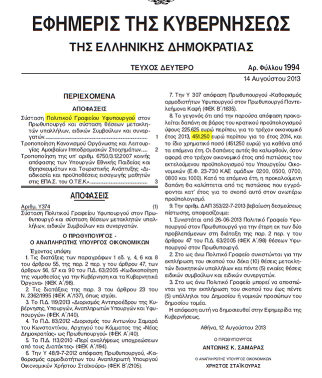 Σε δελτίο Τύπου παραθέτει το παρακάτω ΦΕΚ που συνοδεύεται από την ερώτηση: Πώς σου φαίνεται να πληρώνεις 451.250 ευρώ τον χρόνο για το γραφείο του Παντελή Καψή;