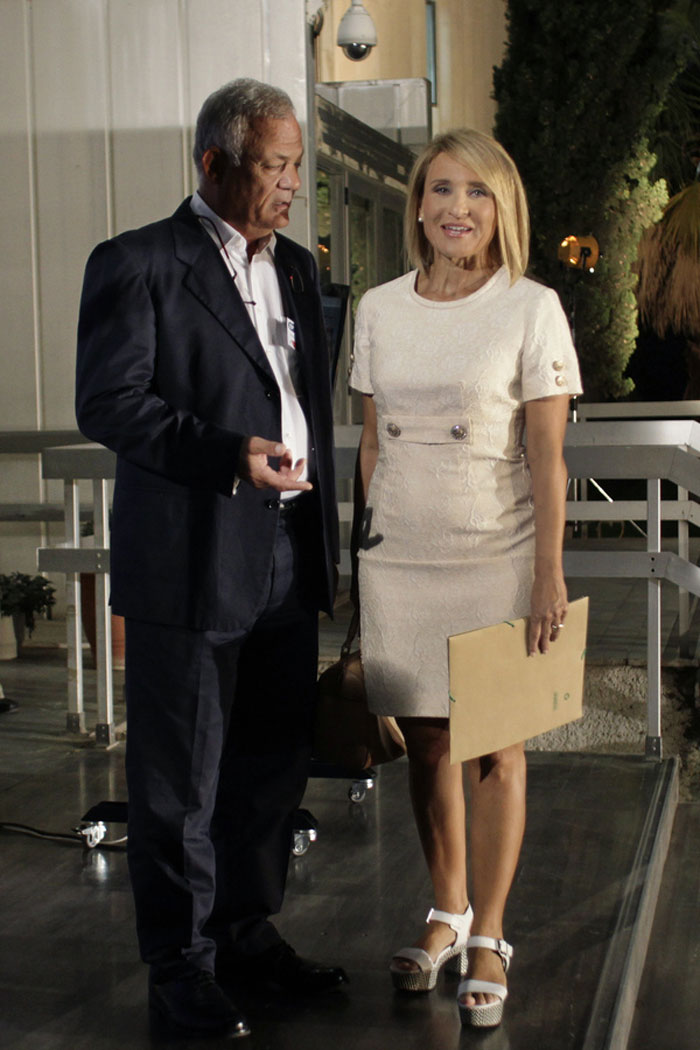 Στον περίβολο του ραδιομεγάρου συνάντησε και τον Αντώνη Σρόιτερ του Alpha, ο οποίος φορούσε ένα σκούρο κοστούμι με άσπρο πουκάμισο και κατευθύνθηκαν μαζί προς τα σκαλιά. Εκεί τους περίμενε ο διευθύνων σύμβουλος της ΕΡΤ Λάμπης Ταχματάρχης όπως και ο πρόεδρος της ΕΡΤ Διονύσης Τσακνής, με τους οποίους αντήλλαξαν θερμή χειραψία.