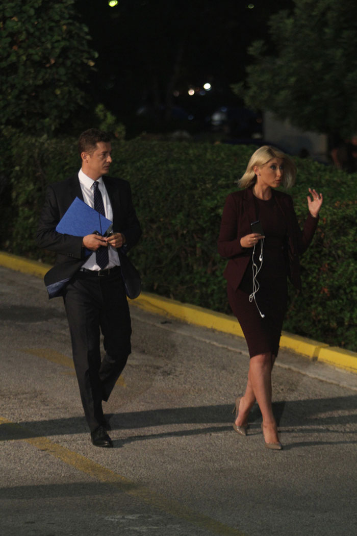 Αμέσως μετά έφτασε η Όλγα Τρέμη του Mega με ένα υπέρκομψο ταγιέρ ροδακινί απόχρωσης. Το συνδύασε με nude ψηλοτάκουνες γόβες και ίδιας απόχρωσης τσάντα, ενώ στο αριστερό της χέρι κρατούσε επίσης μια μαύρη θήκη προφανώς για υπολογιστή.
