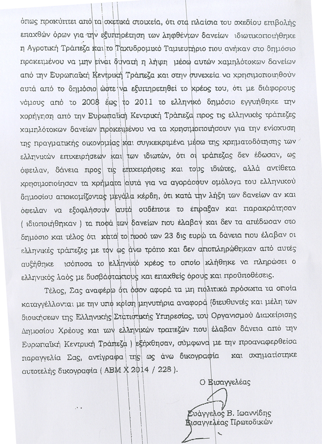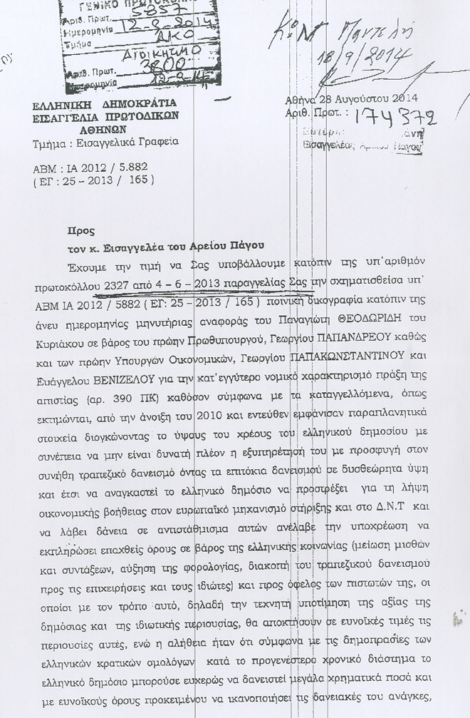 Στη Βουλή διαβιβάστηκε η σχηματισθείσα δικογραφία κατά του πρώην Πρωθυπουργού Γιώργου Παπανδρέου και των τότε υπουργών Γεωργίου Παπακωνσταντίνου και Ευάγγελου Βενιζέλου μετά τη μηνυτήρια αναφορά του Παναγιώτη Θεοδωρίδη του Κυριάκου, ο οποίος ζητά να διερευνηθούν τυχόν ποινικές ευθύνες κυβερνητικών οργάνων για ενέργειες ή παραλείψεις τους που οδήγησαν τη χώρα κατά το έτος 2010 στον Ευρωπαϊκό μηχανισμό στήριξης και το Δ.Ν.Τ για την εξυπηρέτηση των δανειακών αναγκών.