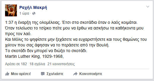 «Στη 1:37 η έναρξη της ολομέλειας. Έτσι στα σκοτάδια όταν ο λαός κοιμάται. Όταν τελειώσει το τσίρκο πείτε μου να έρθω να ασκήσω τα καθήκοντα μου προς τον λαό. Και μόλις το ψηφίσετε μην ξεχάσετε να ευχαριστήσετε και τους θαμώνες του Χίλτον που σας άφησαν να το περάσετε από την Βουλή», ανέφερε σε ανάρτησή της στο Facebook η βουλευτής του ΣΥΡΙΖΑ, Ραχήλ Μακρή.