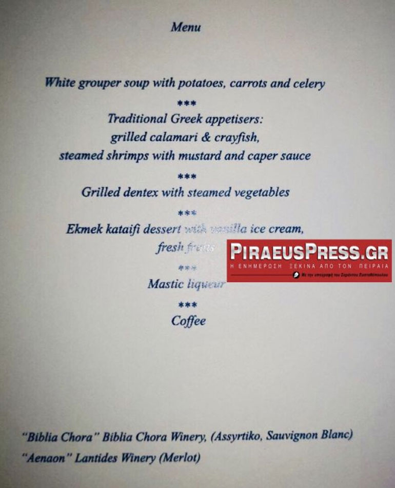 Σύμφωνα με πληροφορίες του piraeuspress.gr, το μενού περιελάμβανε ψαρόσουπα με φρέσκια σφυρίδα και συναγρίδα, ψητό χταπόδι και ψητό καλαμάρι, βραστά λαχανικά (μπρόκολο και κολοκυθάκια).