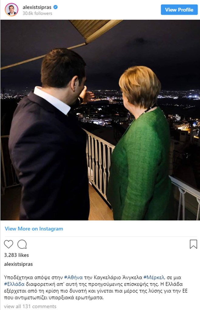 «Υποδέχτηκα απόψε στην Αθήνα την Καγκελάριο Άνγκελα Μέρκελ, σε μια Ελλάδα διαφορετική απ’ αυτή της προηγούμενης επίσκεψής της. Η Ελλάδα εξέρχεται από την κρίση πιο δυνατή και γίνεται πια μέρος της λύσης για την Ε.Ε. που αντιμετωπίζει υπαρξιακά ερωτήματα» έγραψε στον λογαριασμό του στο Instagram ο κ. Τσίπρας, αναρτώντας μια φωτογραφία του με την Άνγκελα Μέρκελ, στην οποία φαίνεται πλάτη ο πρωθυπουργός και η Γερμανίδα καγκελάριος και στο βάθος η θάλασσα και «πιάτο» τα νότια προάστια.