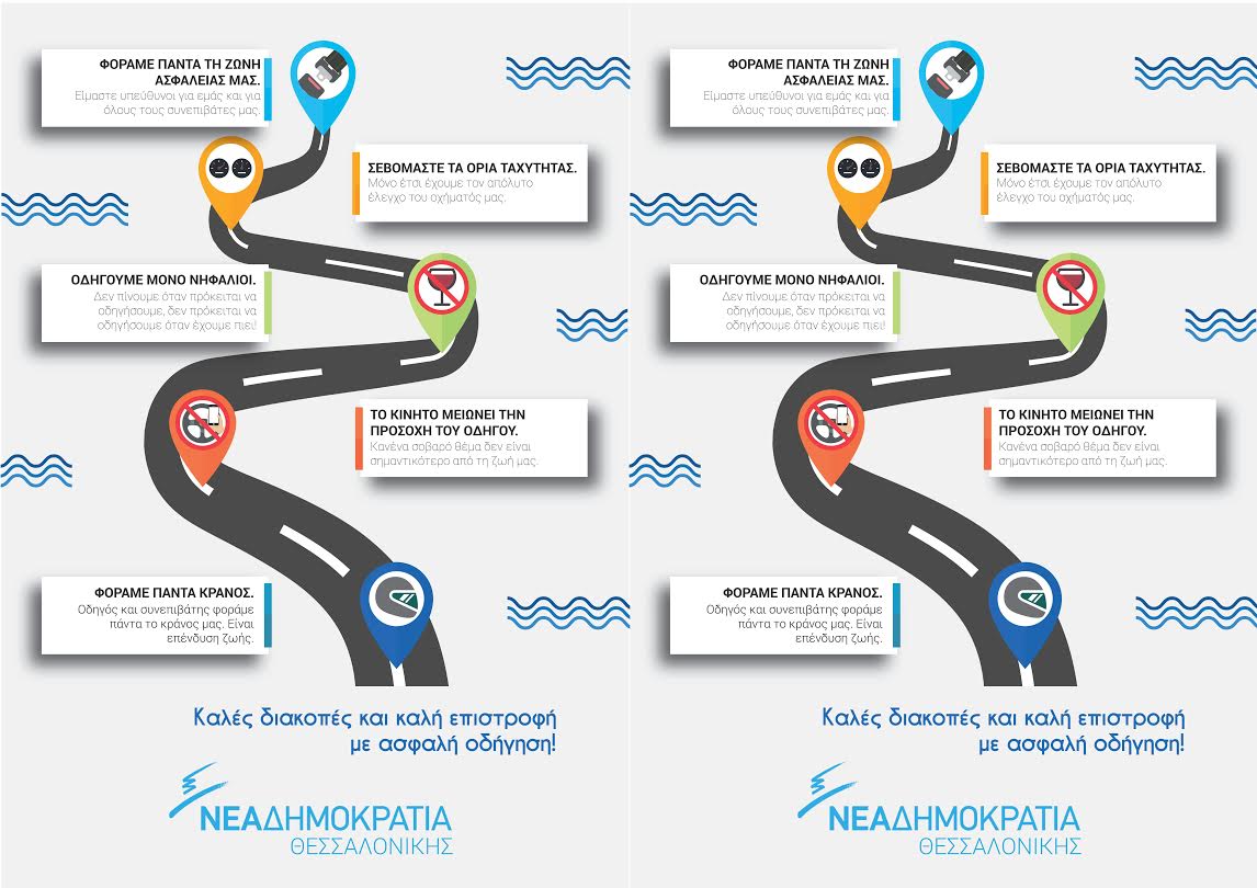 Τη μεγάλη βαρύτητα και σημασία για την οδική ασφάλεια και την κυκλοφοριακή συμπεριφορά που δίνει η ΝΔ Θεσσαλονίκης, απέδειξε έμπρακτα με την κοινωνική δράση της, για την προώθηση της ασφαλούς οδήγησης. Η ευαισθητοποίηση όλων γίνεται ιδιαίτερα απαραίτητη κατά την περίοδο των θερινών εξορμήσεων και διακοπών. Τα γαλάζια στελέχη διένειμαν ενημερωτικά φυλλάδια με χρήσιμες συμβουλές σε οδηγούς διερχόμενων οχημάτων από τα σημεία:
